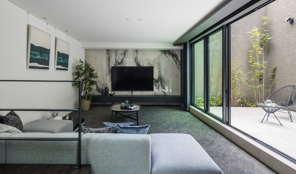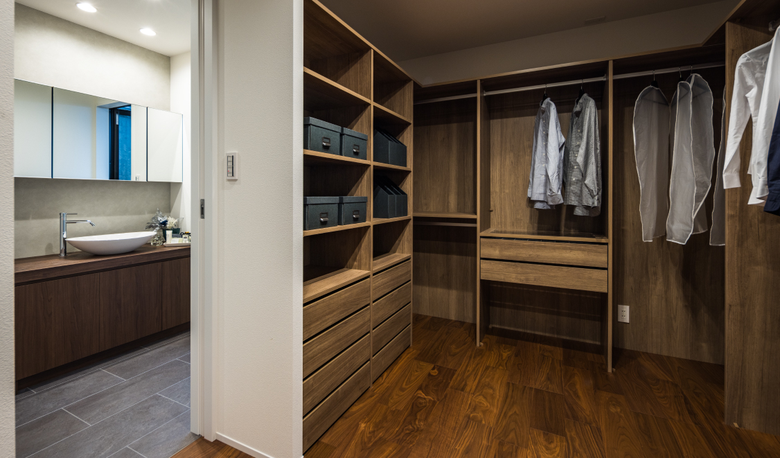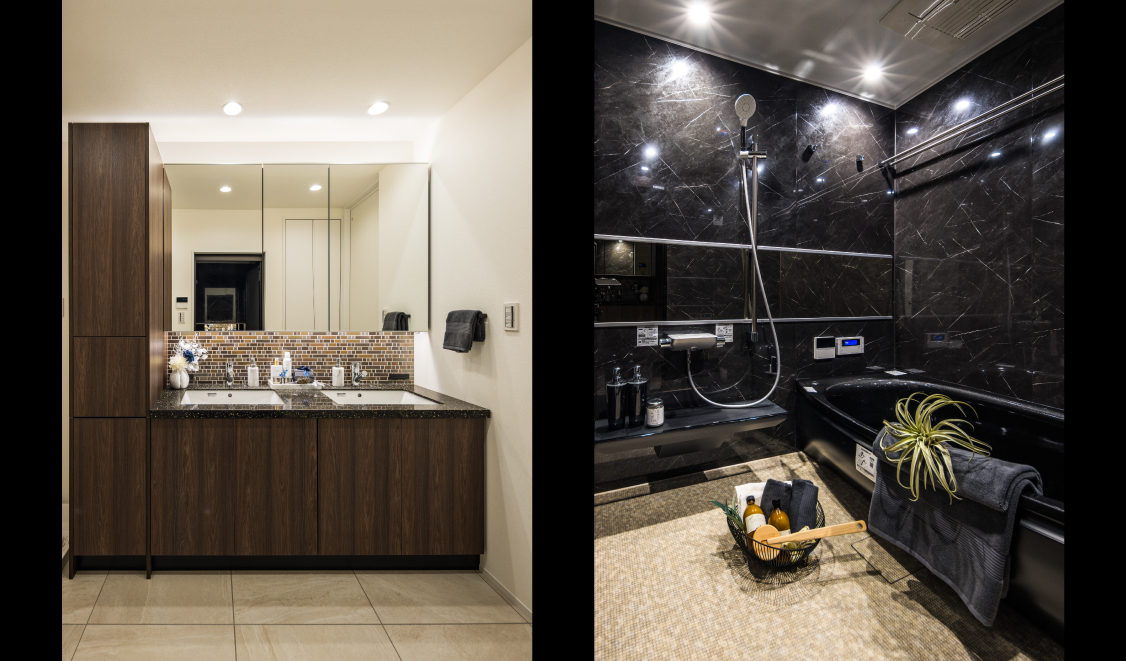 空間のアクセントとしてあしらったマーブル調の素材が、上質さと洗練された印象を引き立て、シンプルの中にも奥行きのある表情を演出します。