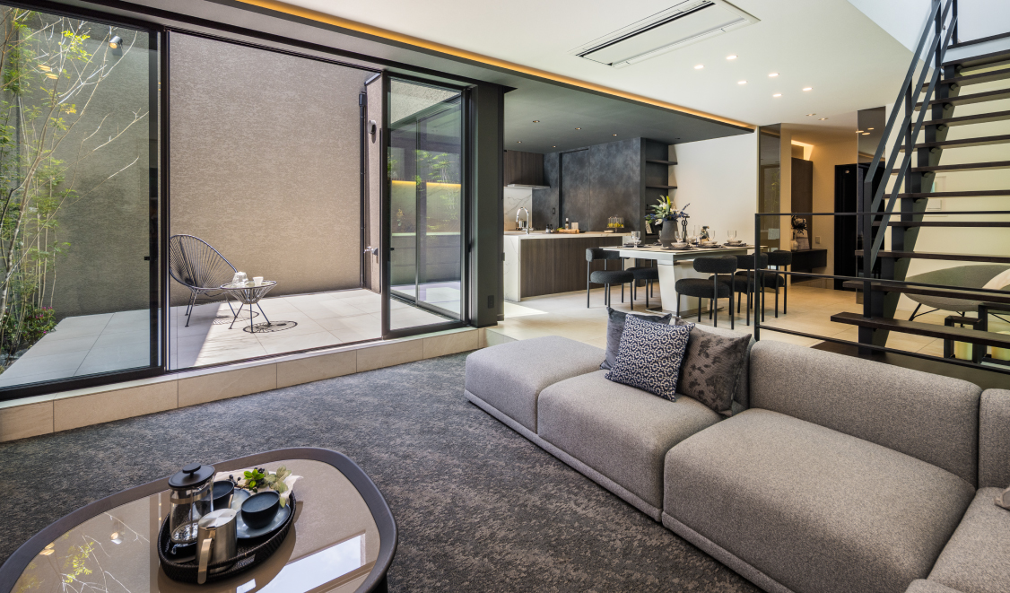 中庭と大きな開口でゆるやかにつながるLDK。