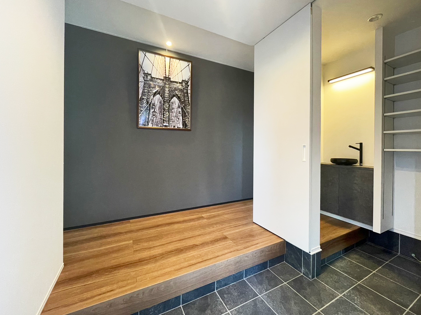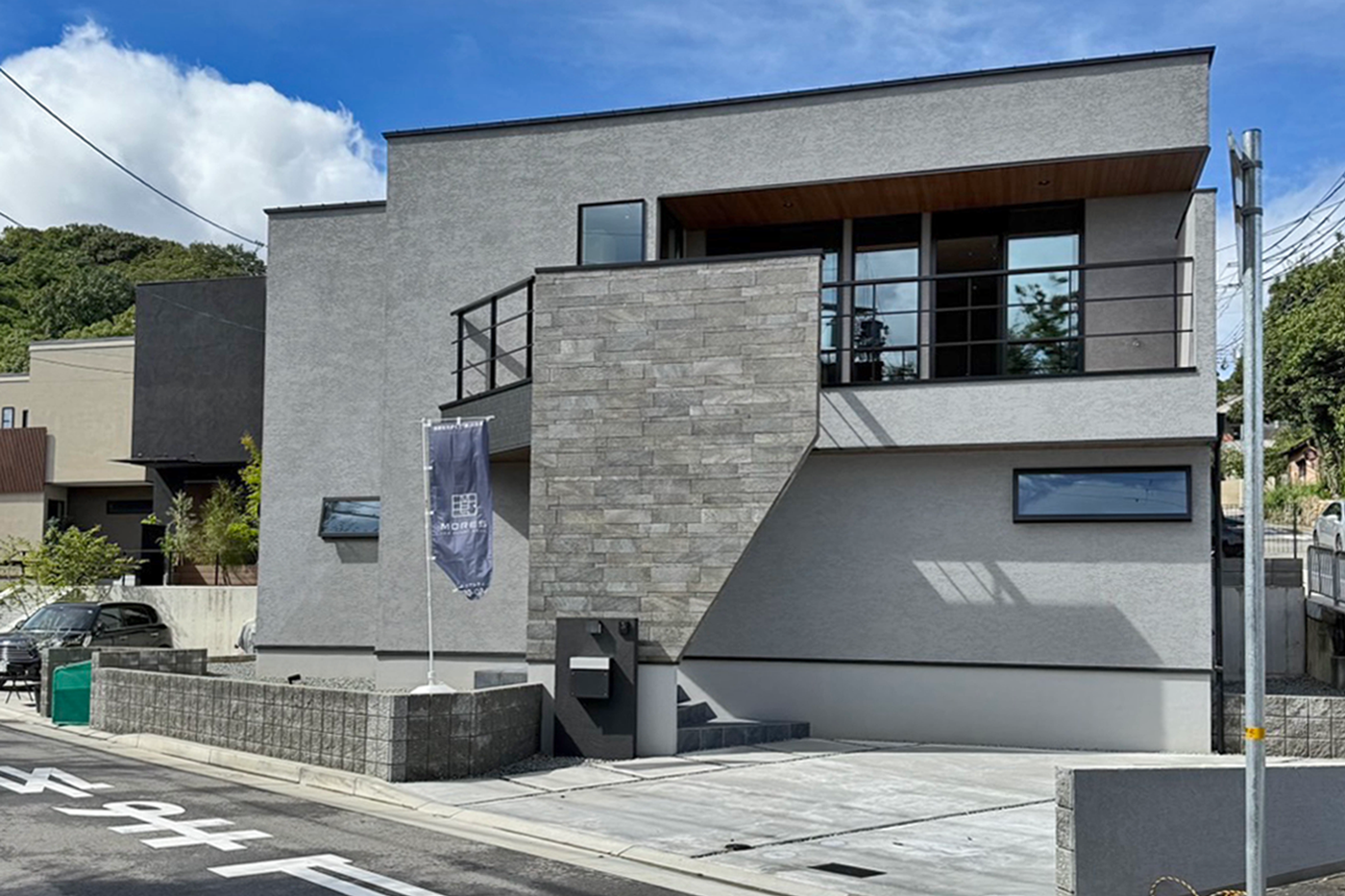 グレーを基調とした外観に石調タイルをアクセントにあしらい、直線的なフォルムが際立つ大胆なファサード。