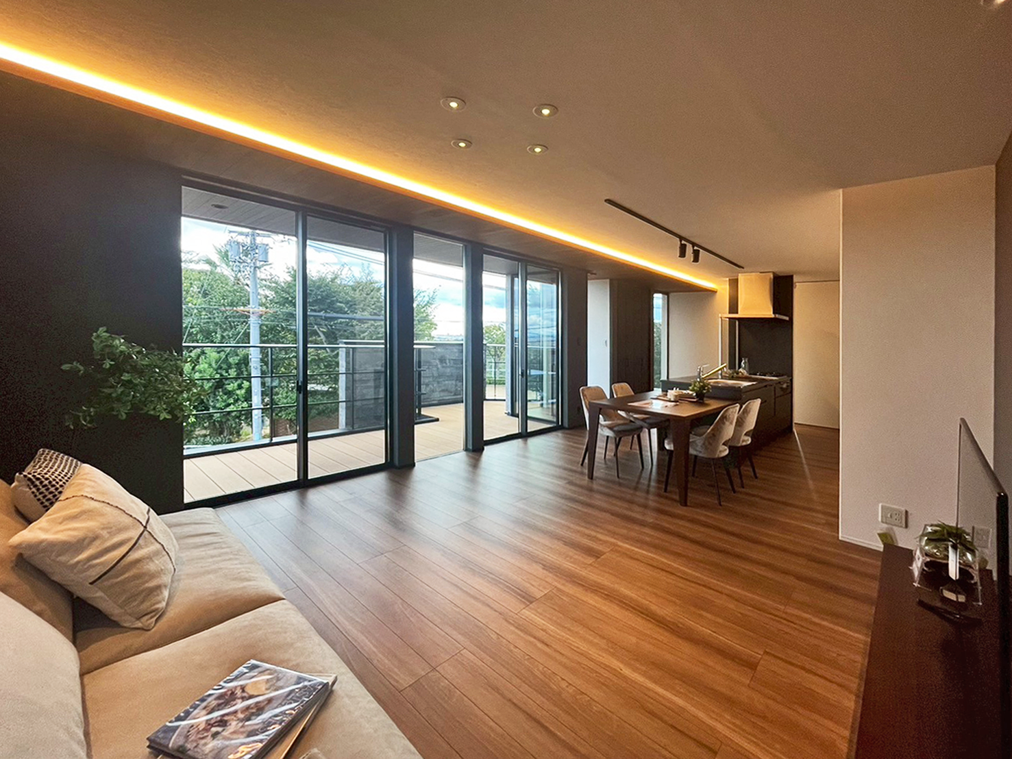 LDKとフラットに繋がる南向きの広々としたバルコニーは、心地良い陽光に包まれる贅沢な空間。