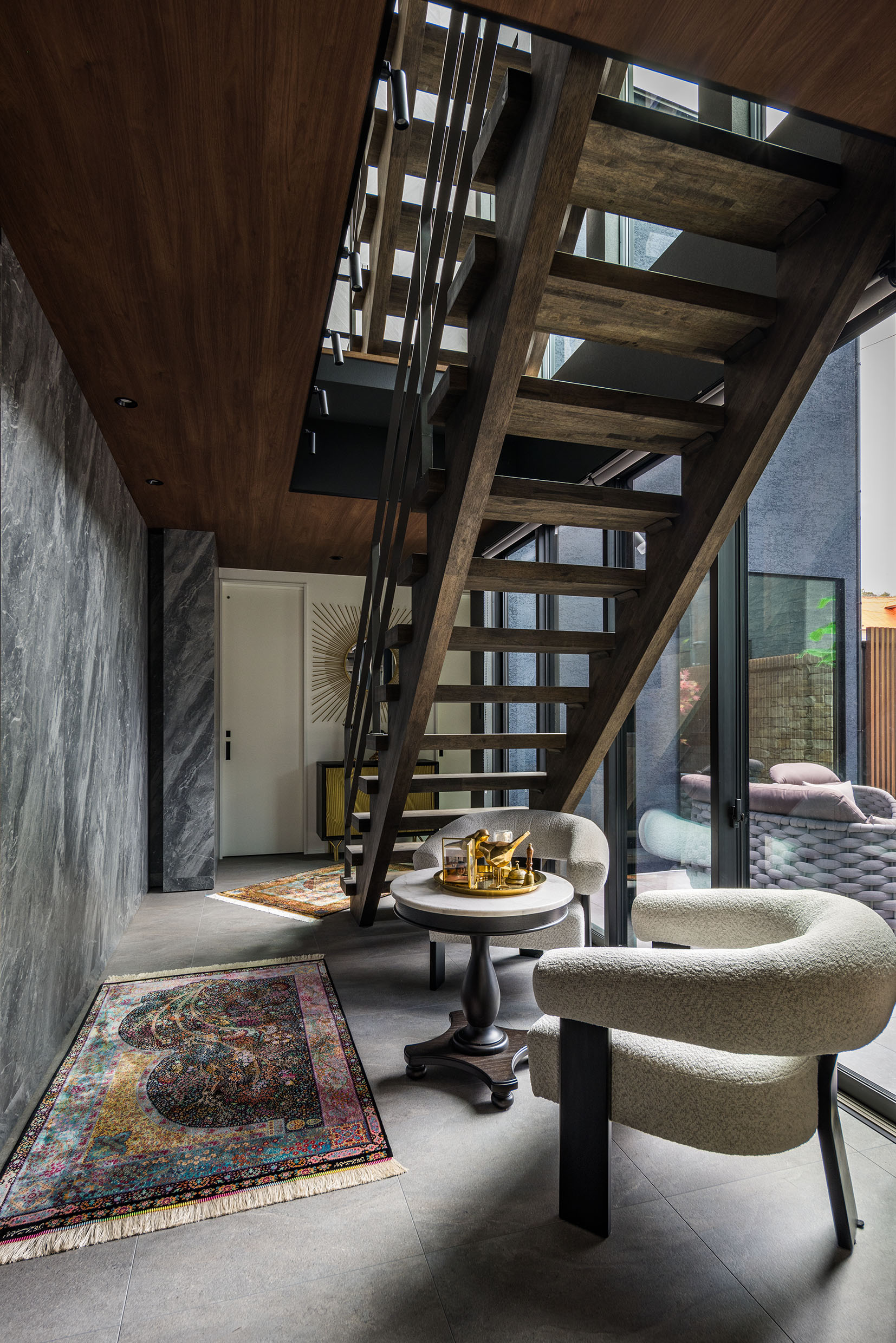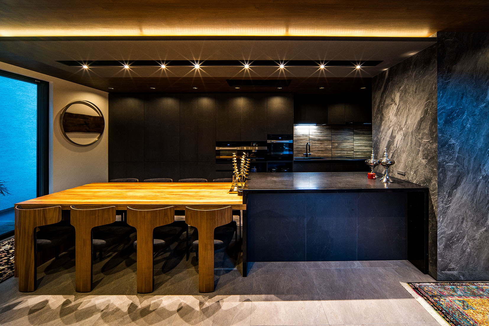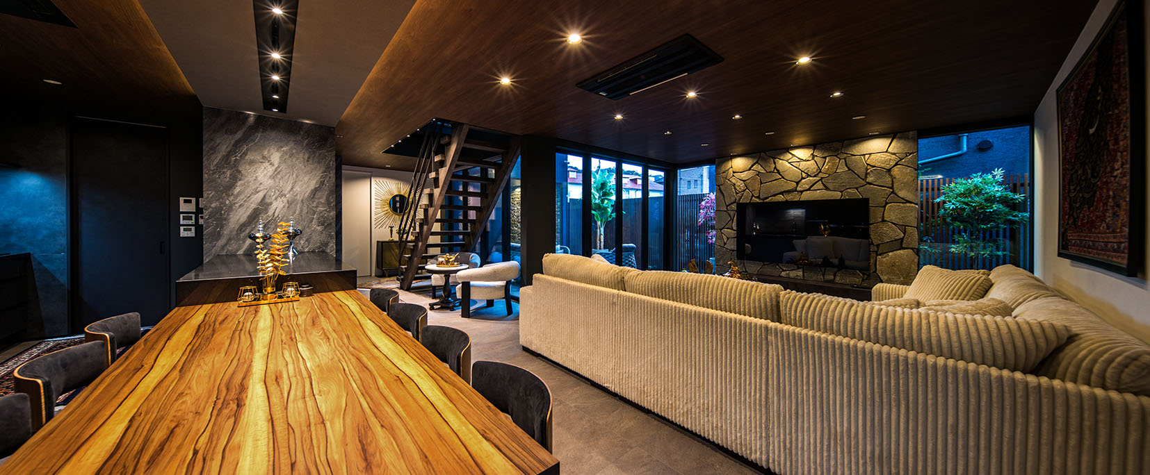 深いブラウンの木質天井とグレートーンのシンプルモダンが織りなす、優雅で洗練された空間。