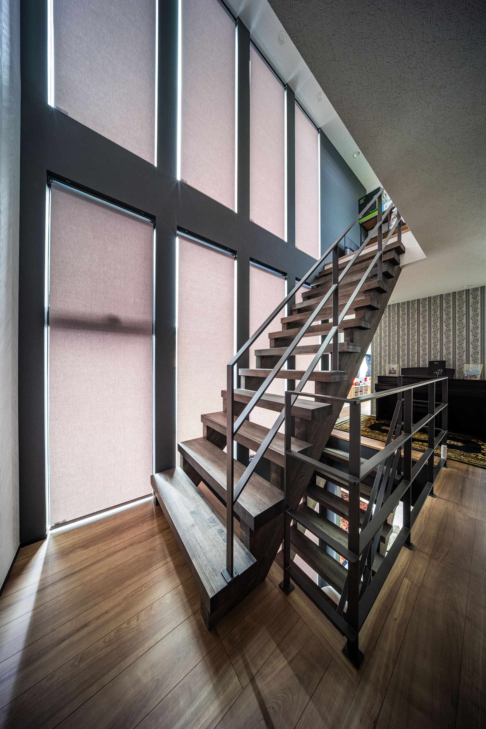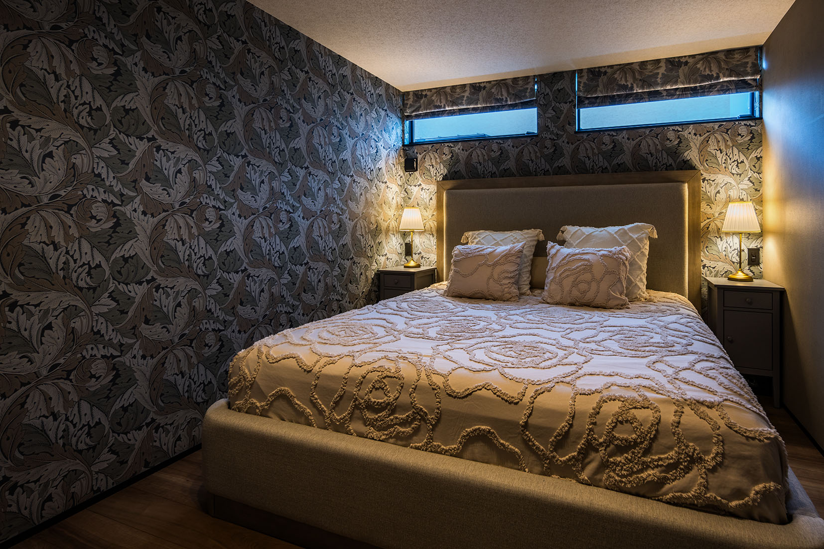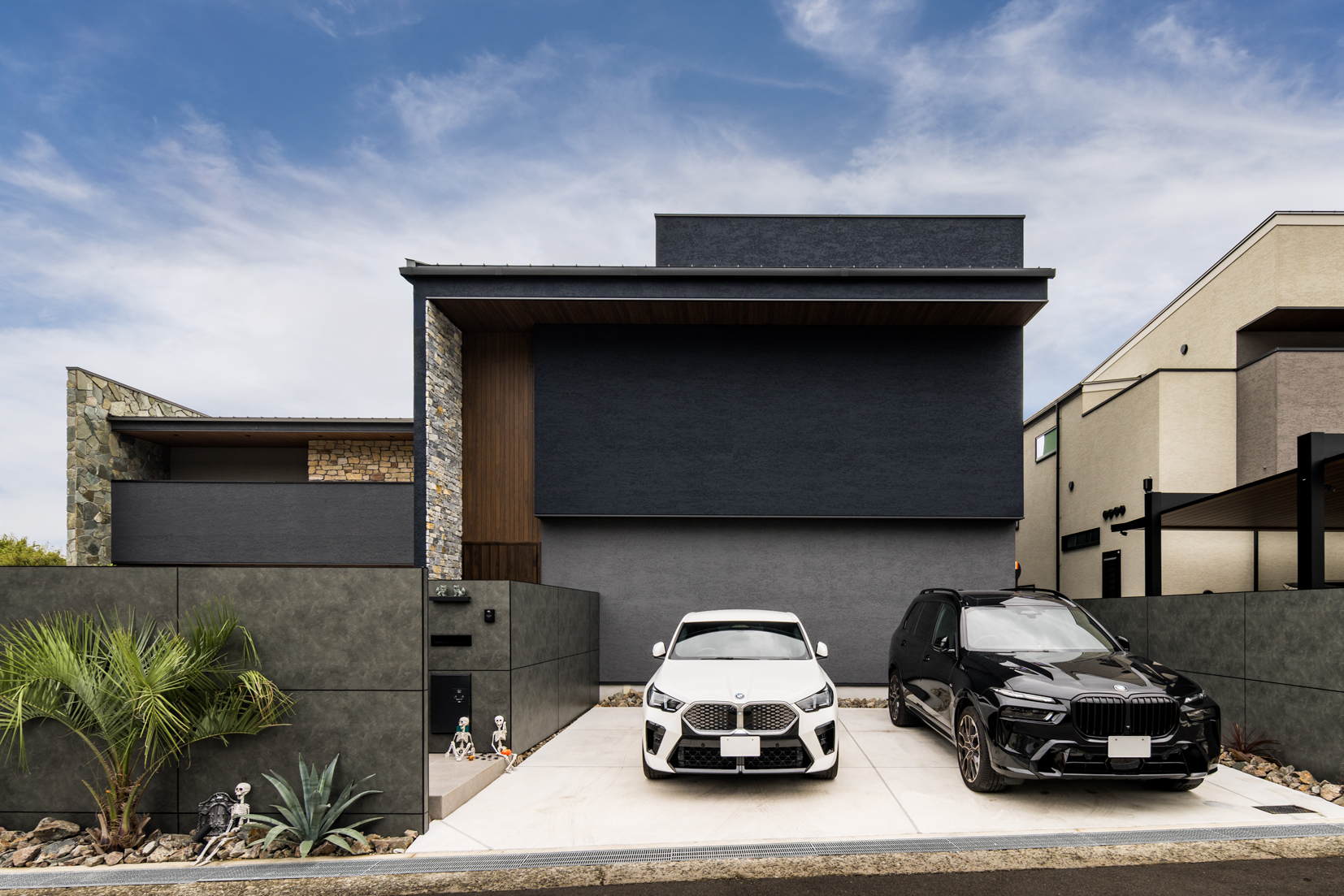 深いブラウンの木質天井とグレートーンのシンプルモダンが織りなす、優雅で洗練された空間。