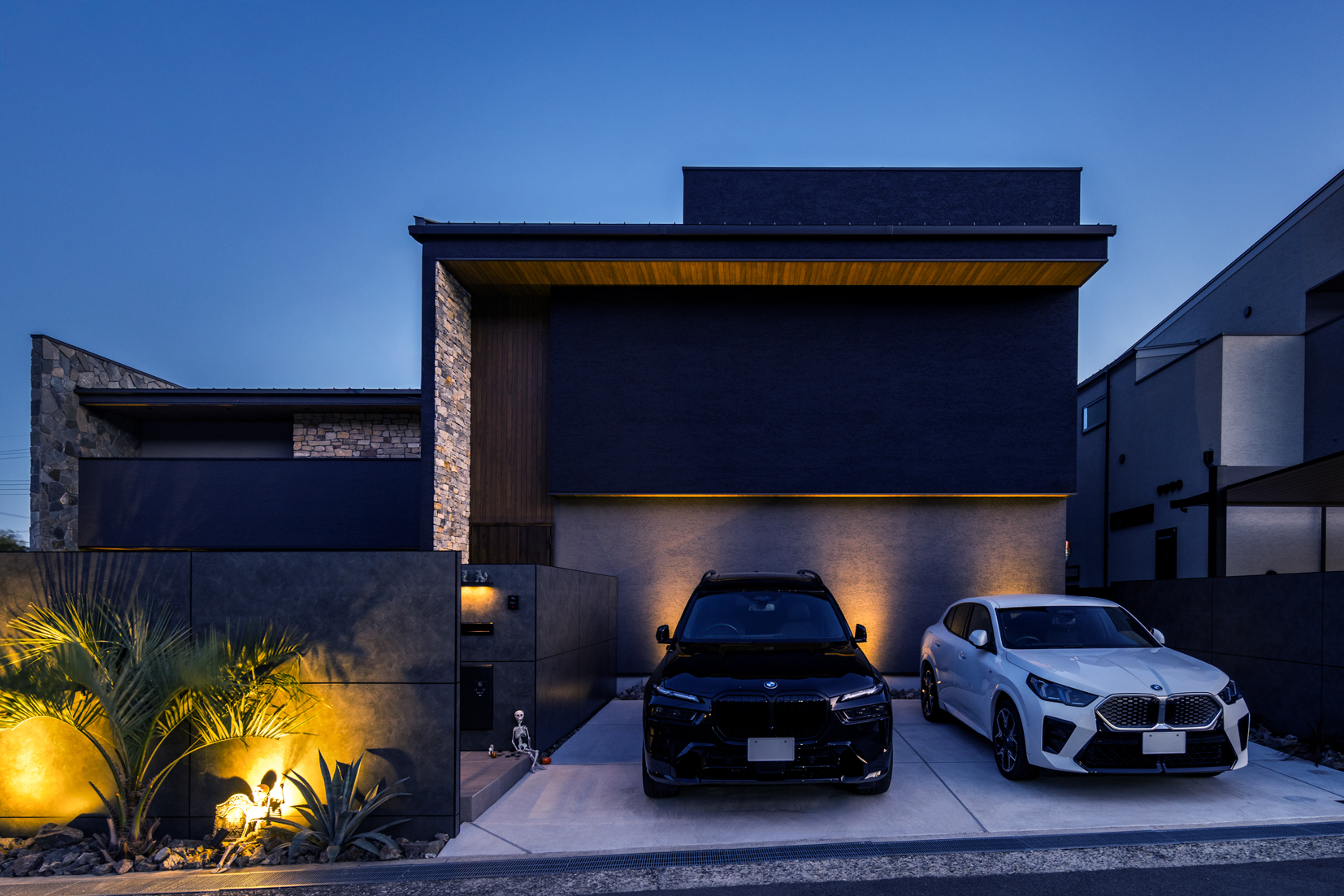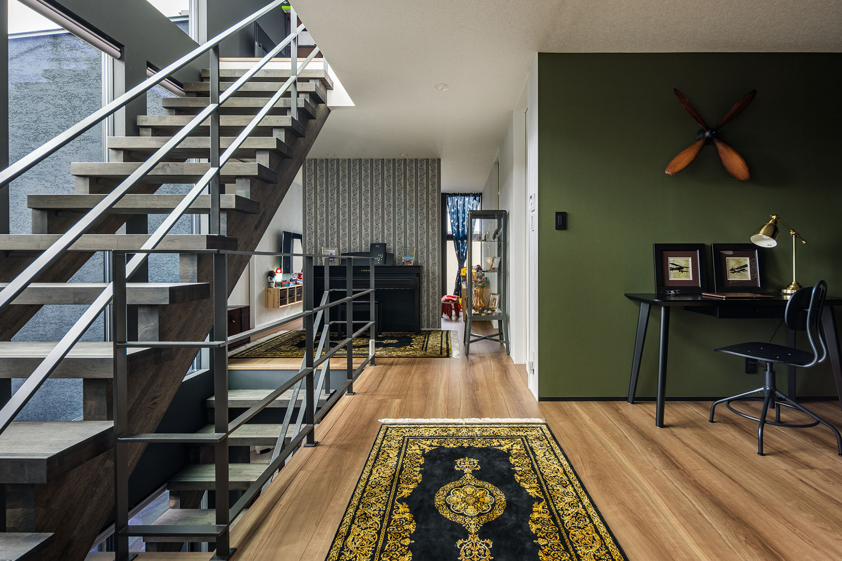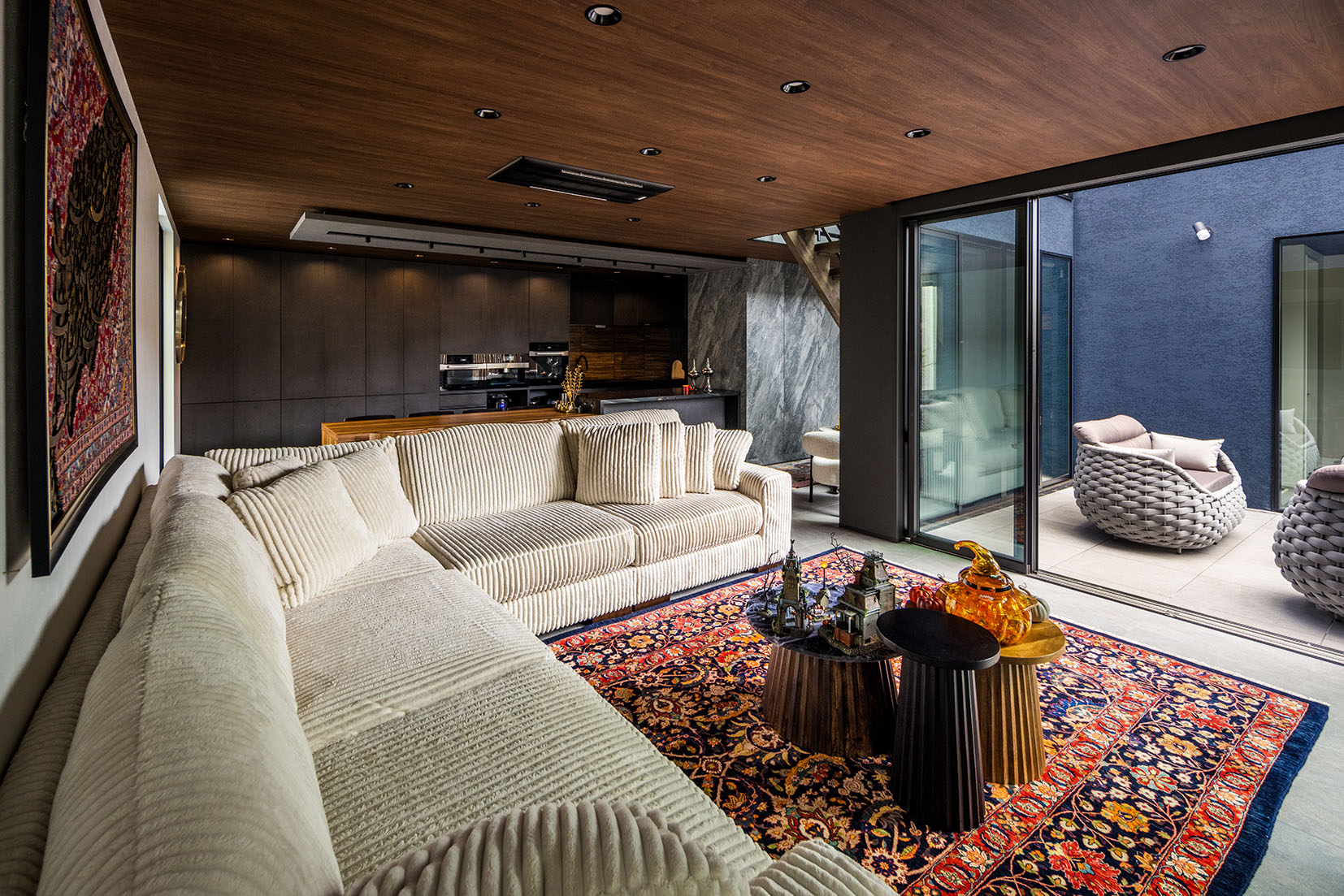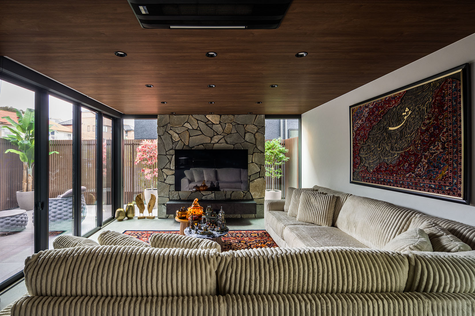 フェニックスの緑が風に揺れ、お施主様こだわりのペルシャ絨毯が唯一無二の個性を添えています。