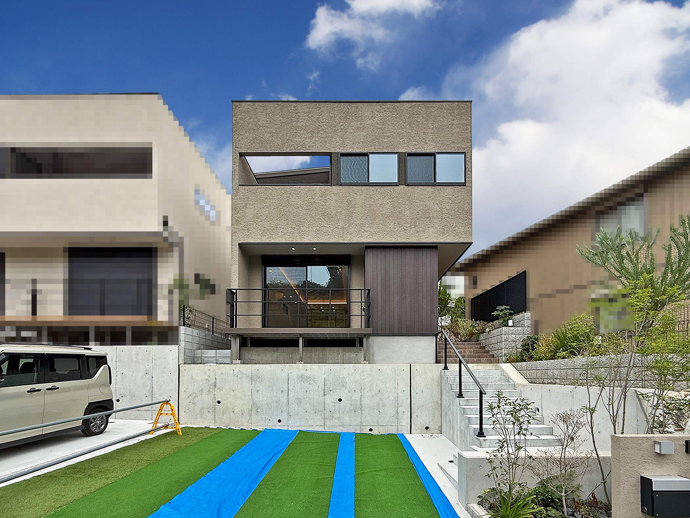 直線美が際立つモダンなファサードと、高低差を活かした計画的なランドスケープが、邸宅の存在感を放つ住まい。