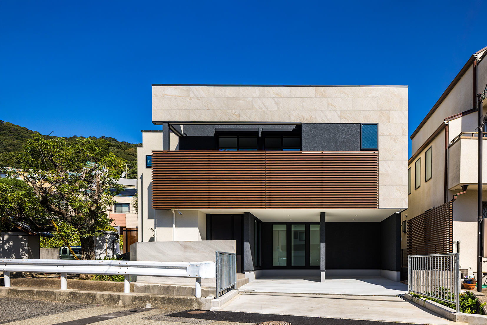 ベージュの大判タイルと木目格子の組み合わせが印象的なファサード。