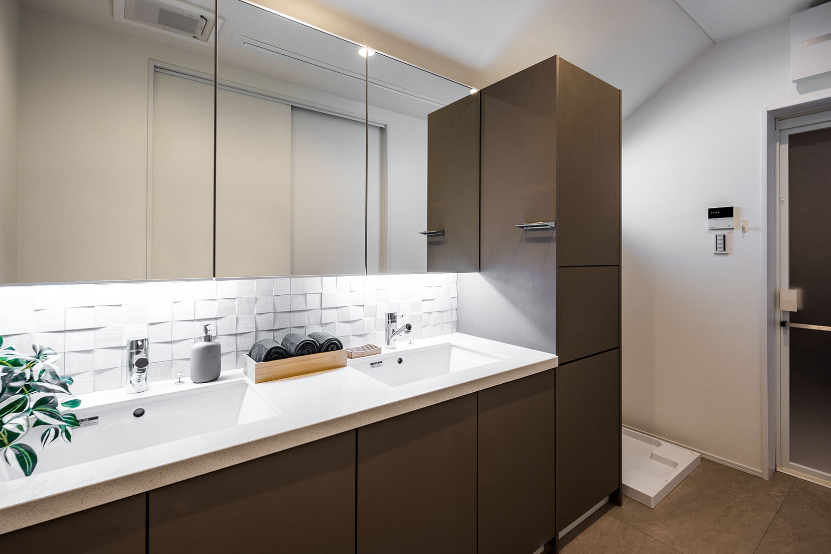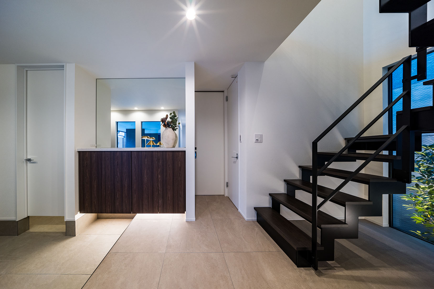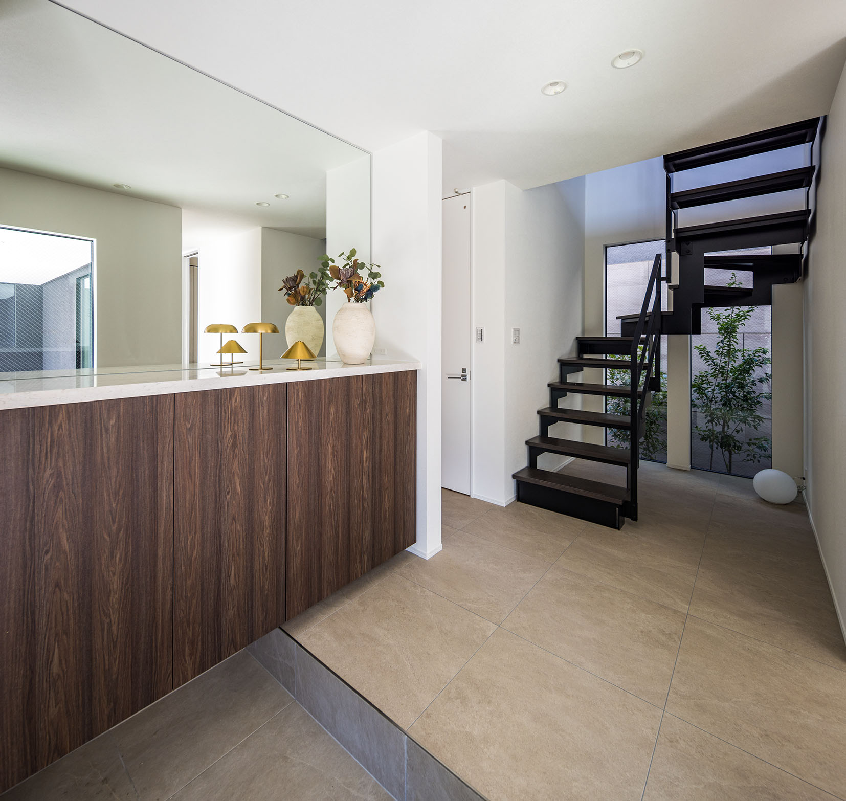 玄関まわりには、飾り棚としても使用できるキャビネットと壁面ミラーを採用。
