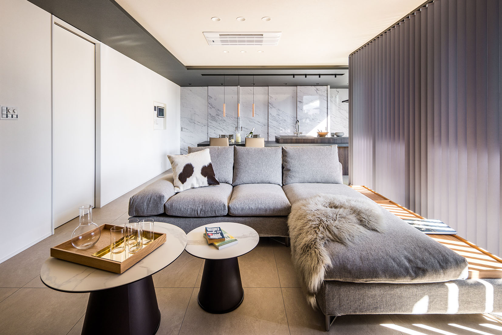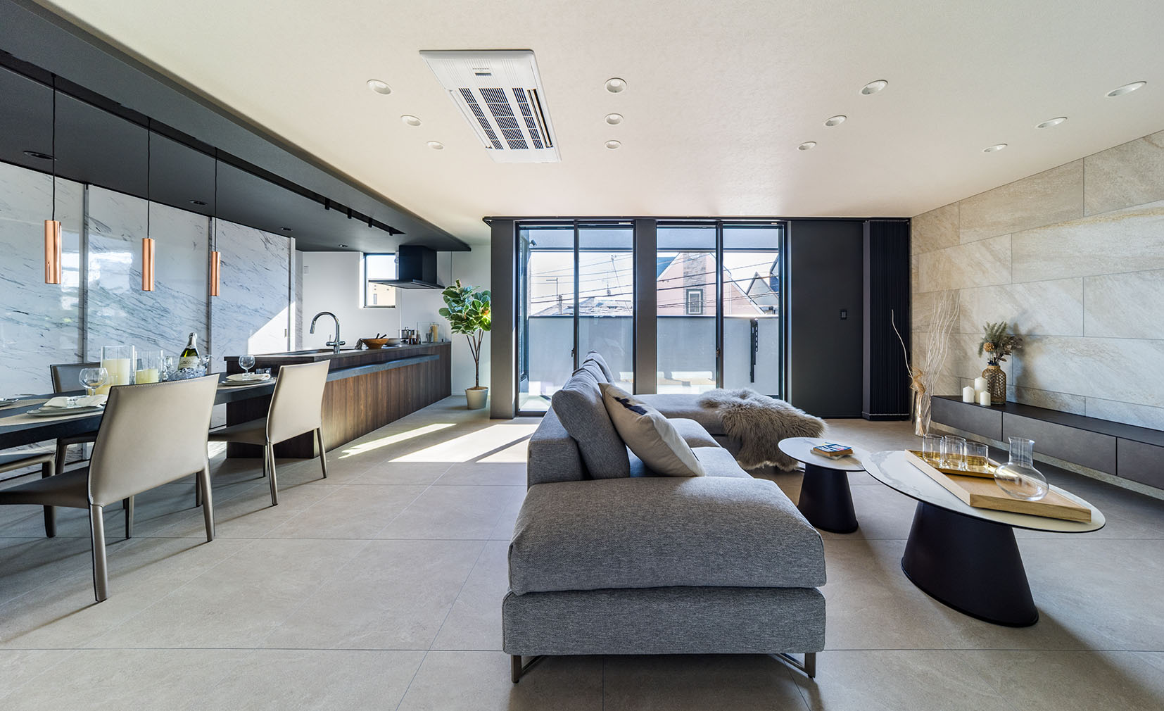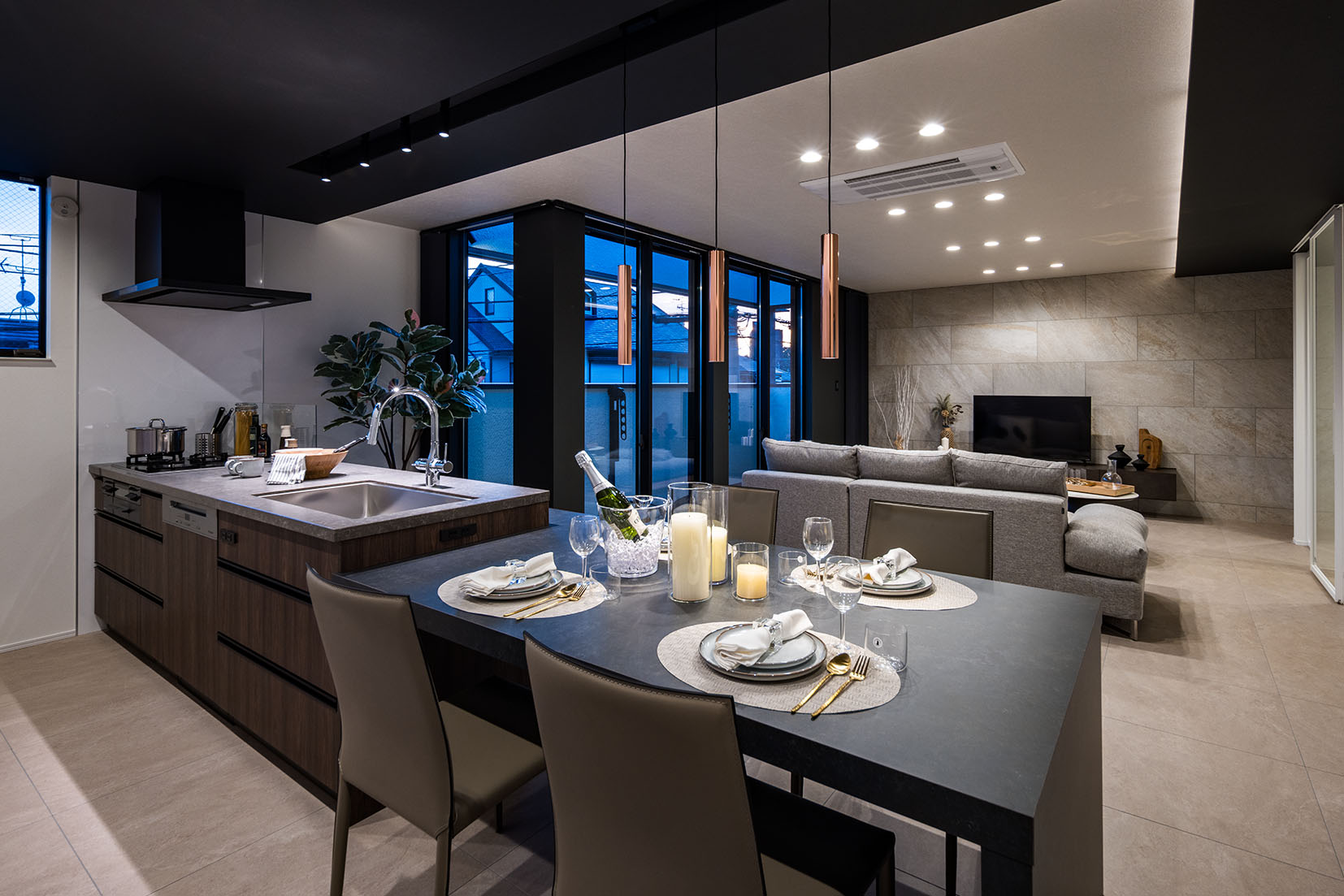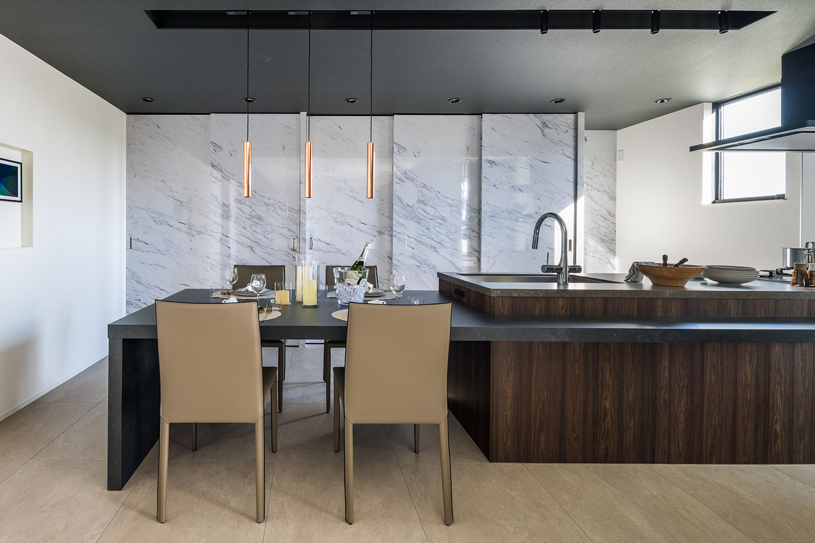 ダイニングテーブルと一体型となったキッチンはホテルライクな空間を演出しつつ、食事も会話も自然と弾む暮らしを叶えます。