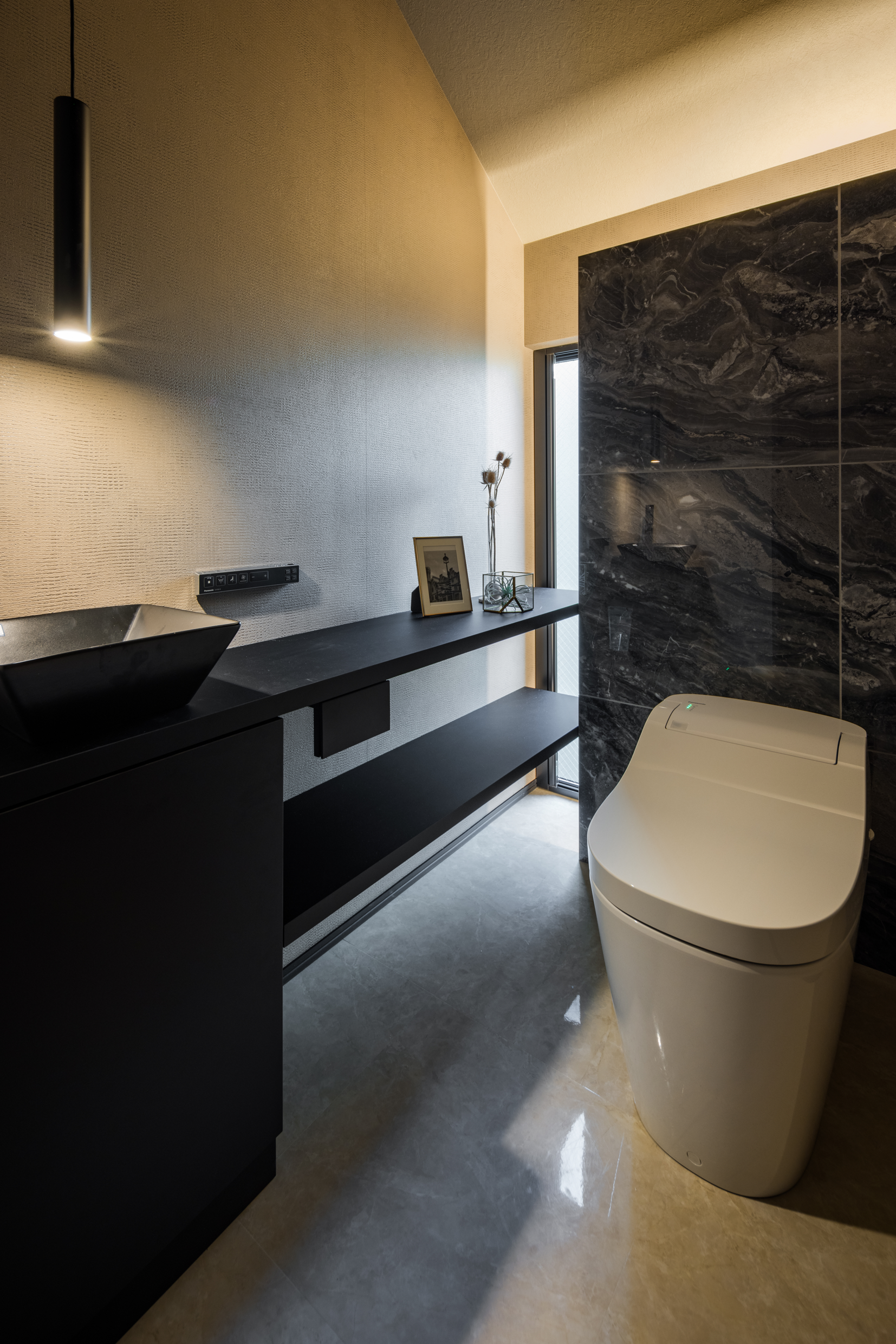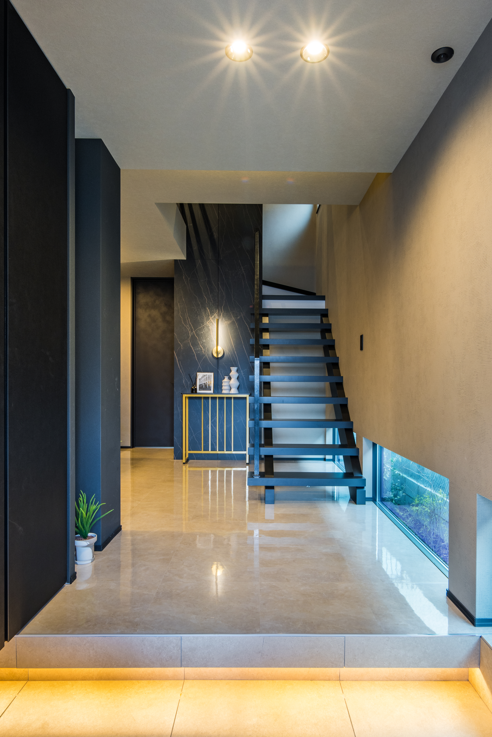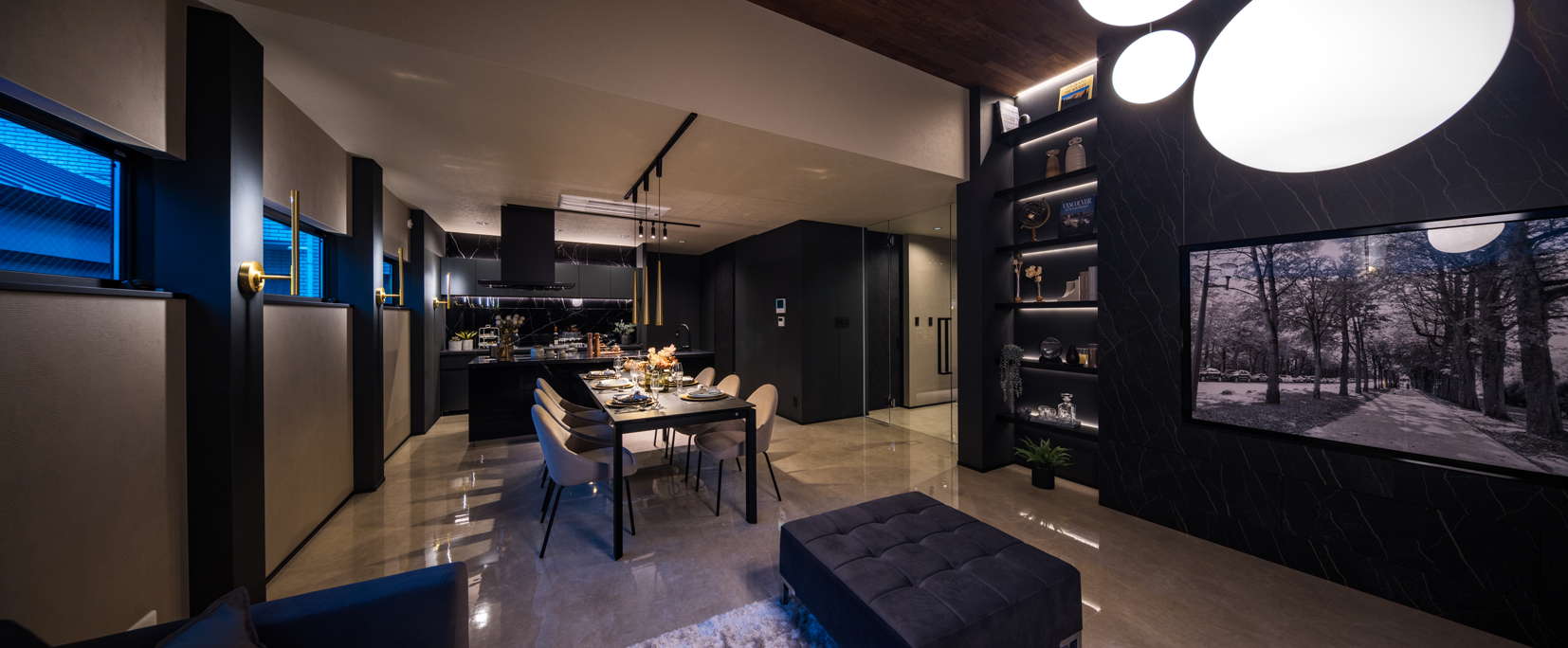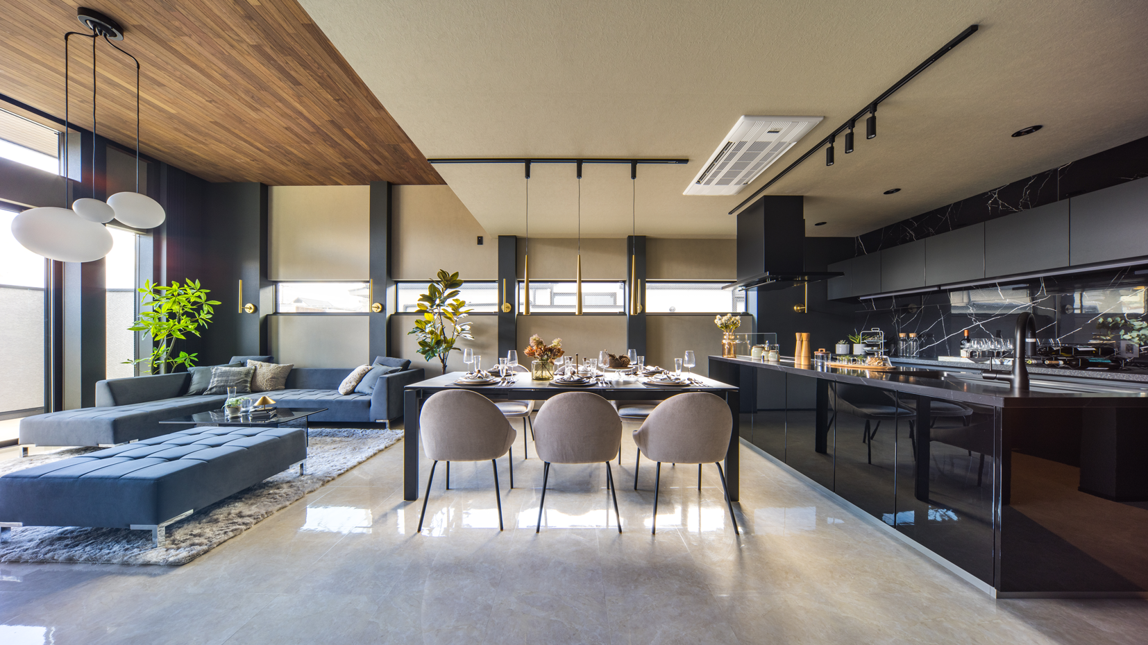 ブラックを基調とした落ち着きのある色調に、石目調の素材感と木のぬくもりを重ねた住まい。
