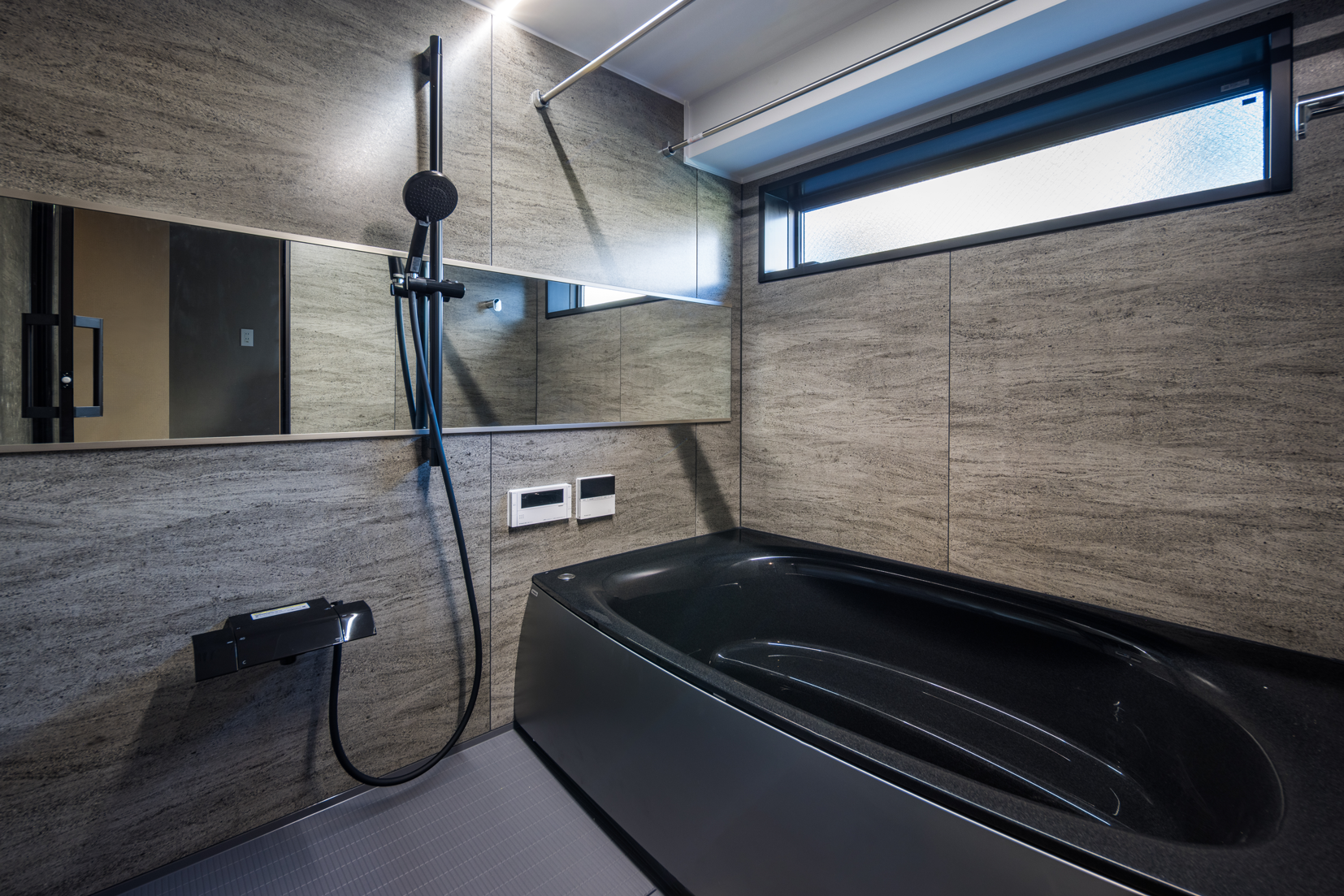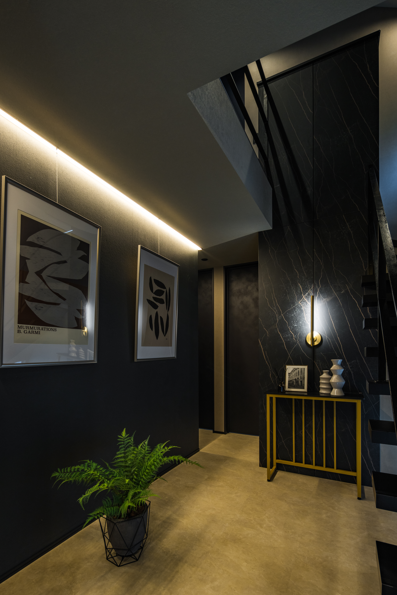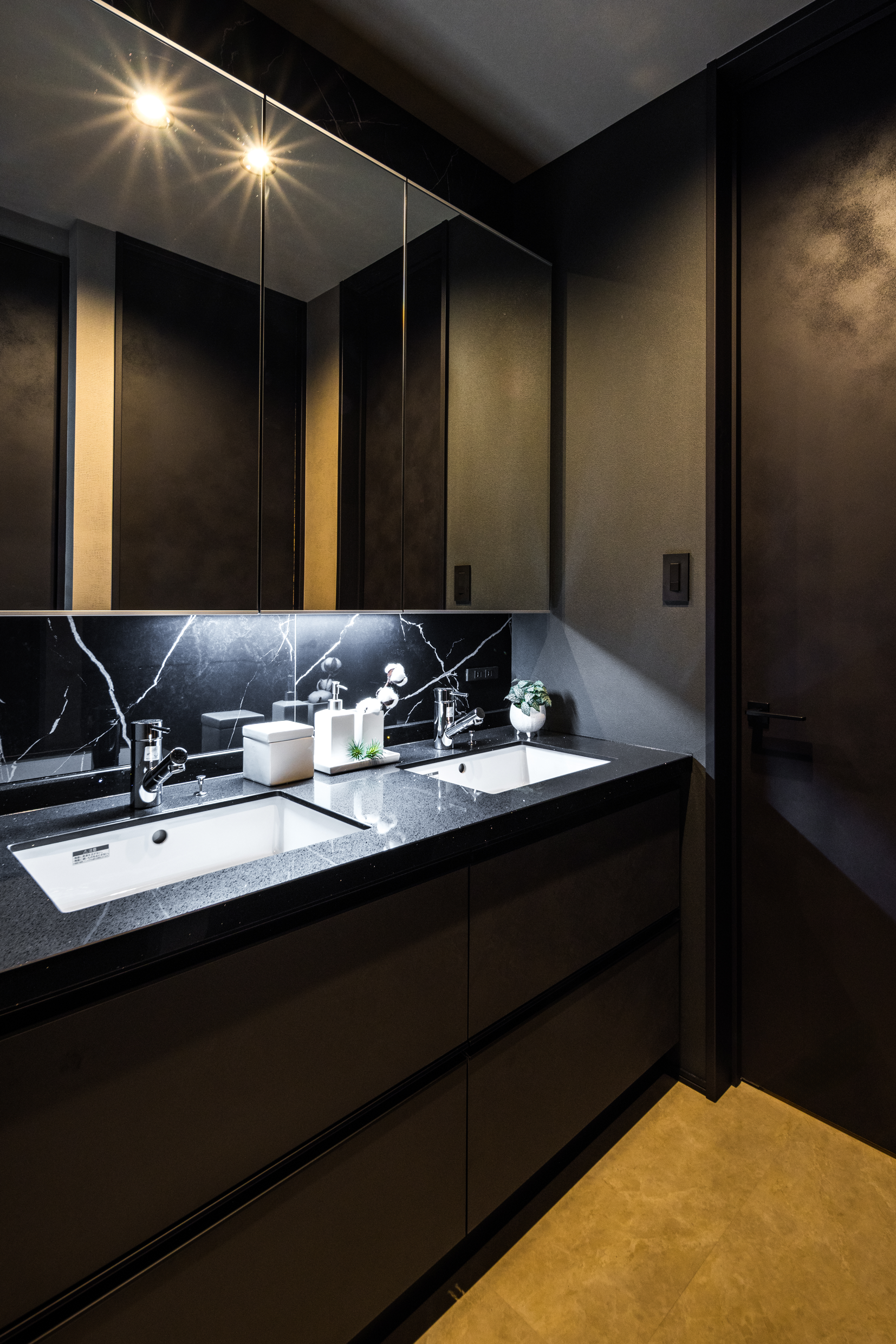 ブラックを基調とした落ち着きのある色調に、石目調の素材感と木のぬくもりを重ねた住まい。