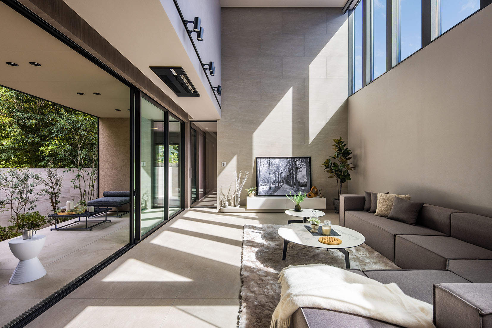 吹き抜け×FIX窓のリビングや、中庭に面した大きなスライドドアが印象的なLDKは、強いアクセントウォールなどは採用せずアースカラーで構成。