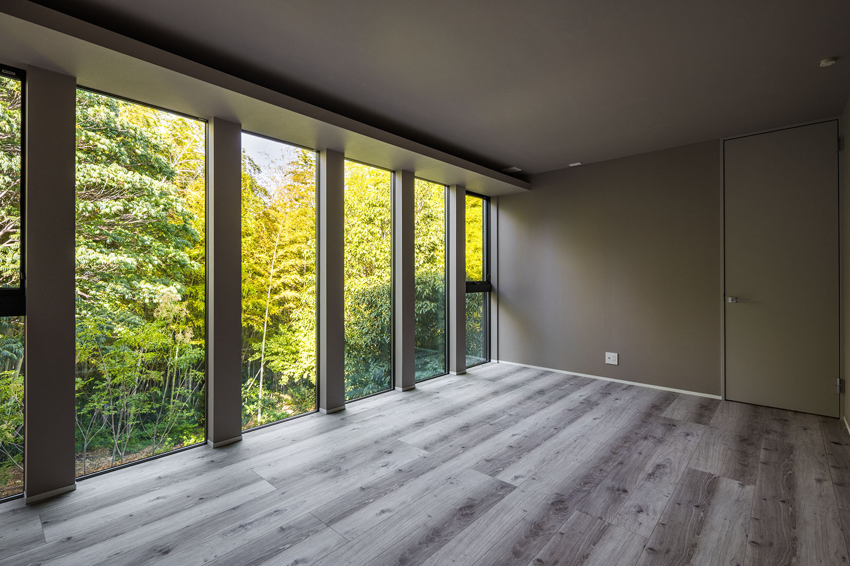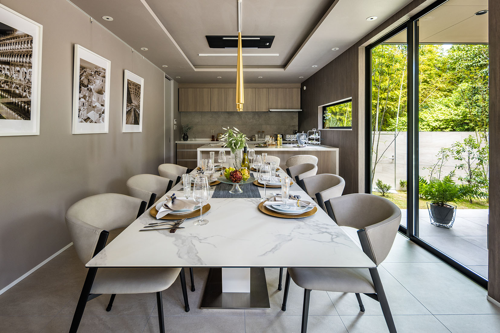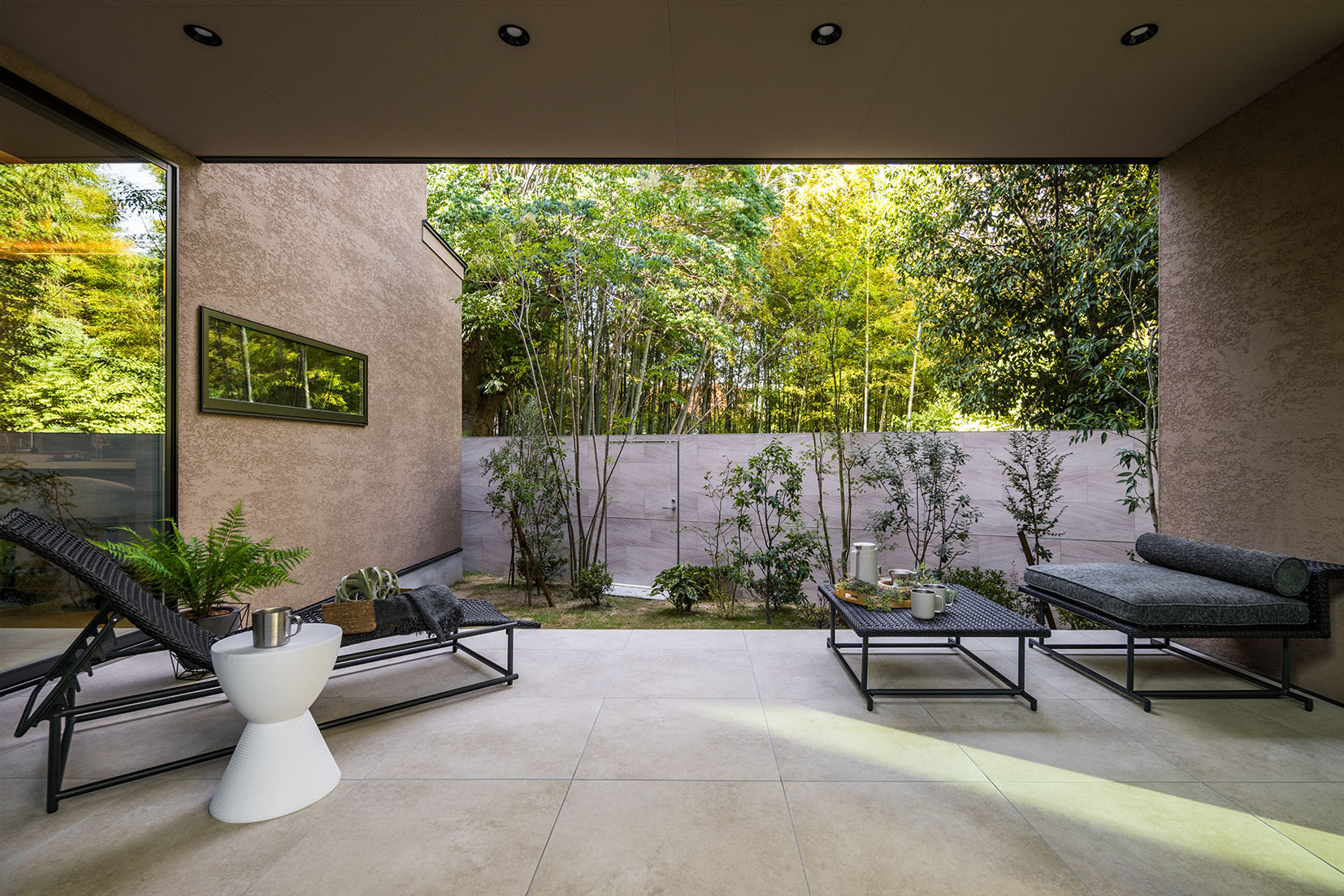 LDKとフラットに繋がる中庭は外の緑がインテリアの延長として感じられ、四季を楽しめる完全プライベート空間に。