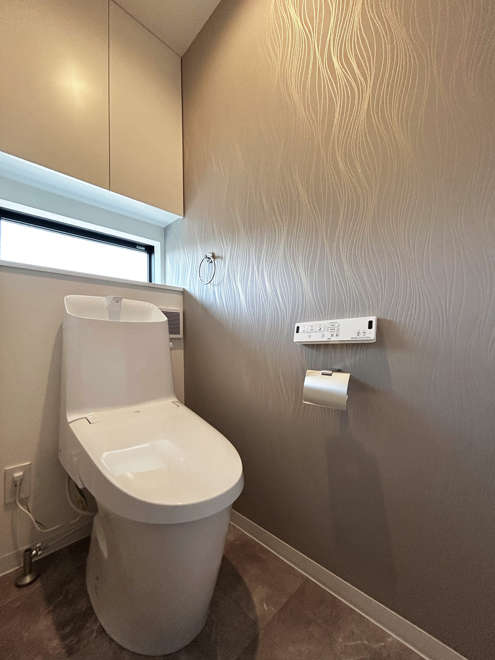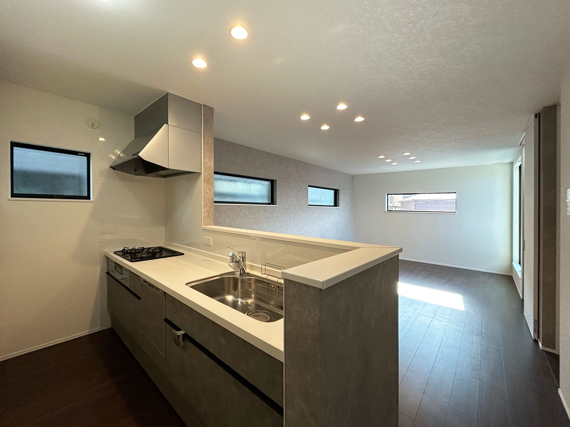 LDKは横長のスリット窓を効果的に配置することで、プライバシーを守りつつやわらかな自然光を取り込み、落ち着きのある明るさを確保。
