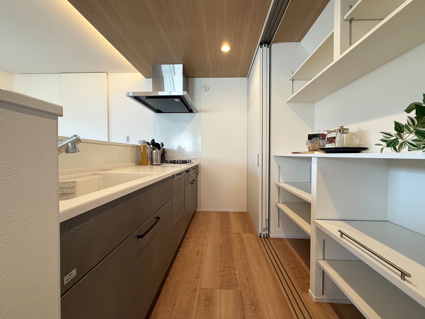 キッチンからダイニング・リビングまでが一直線につながる開放的な空間構成で、視線の抜けと広がりを感じられます。