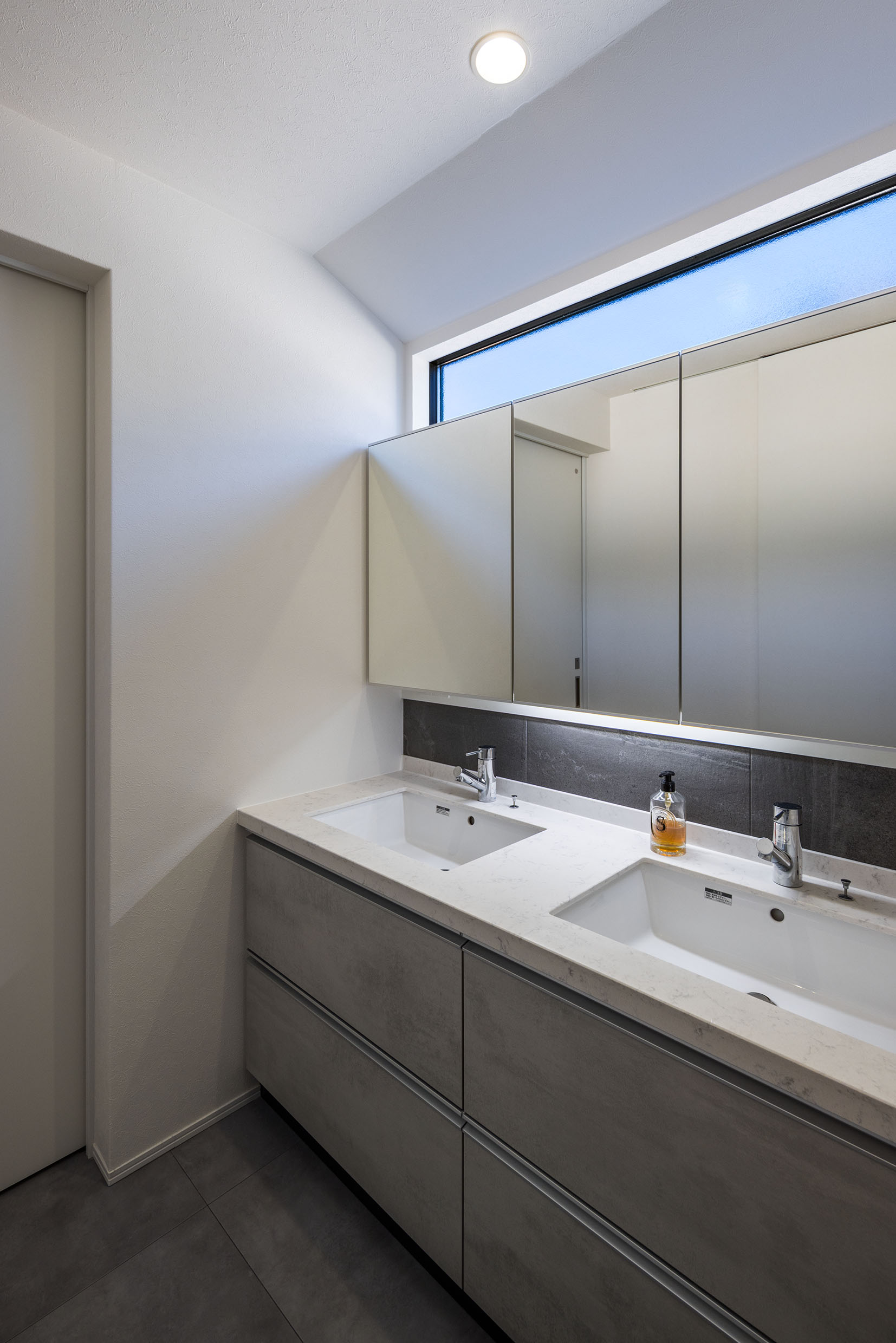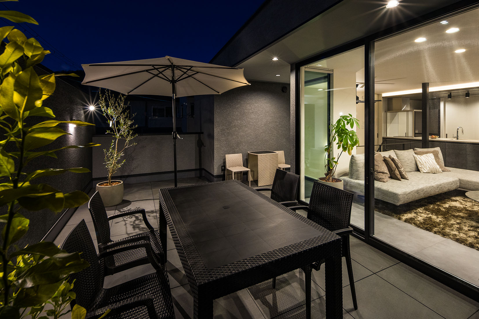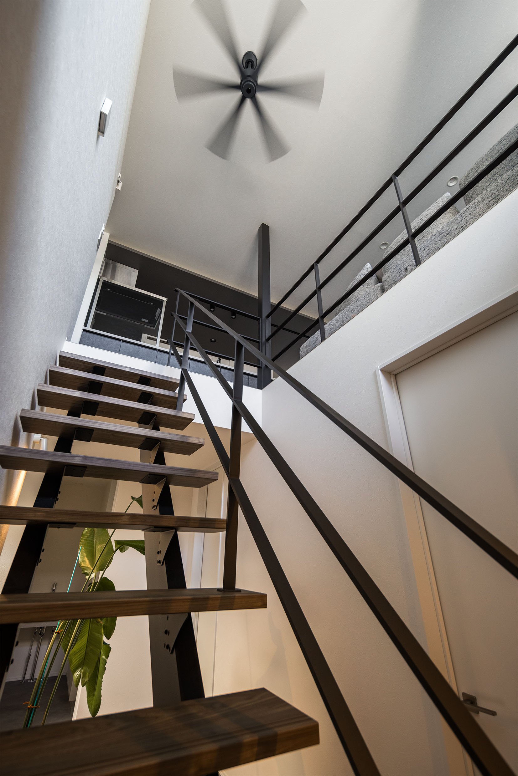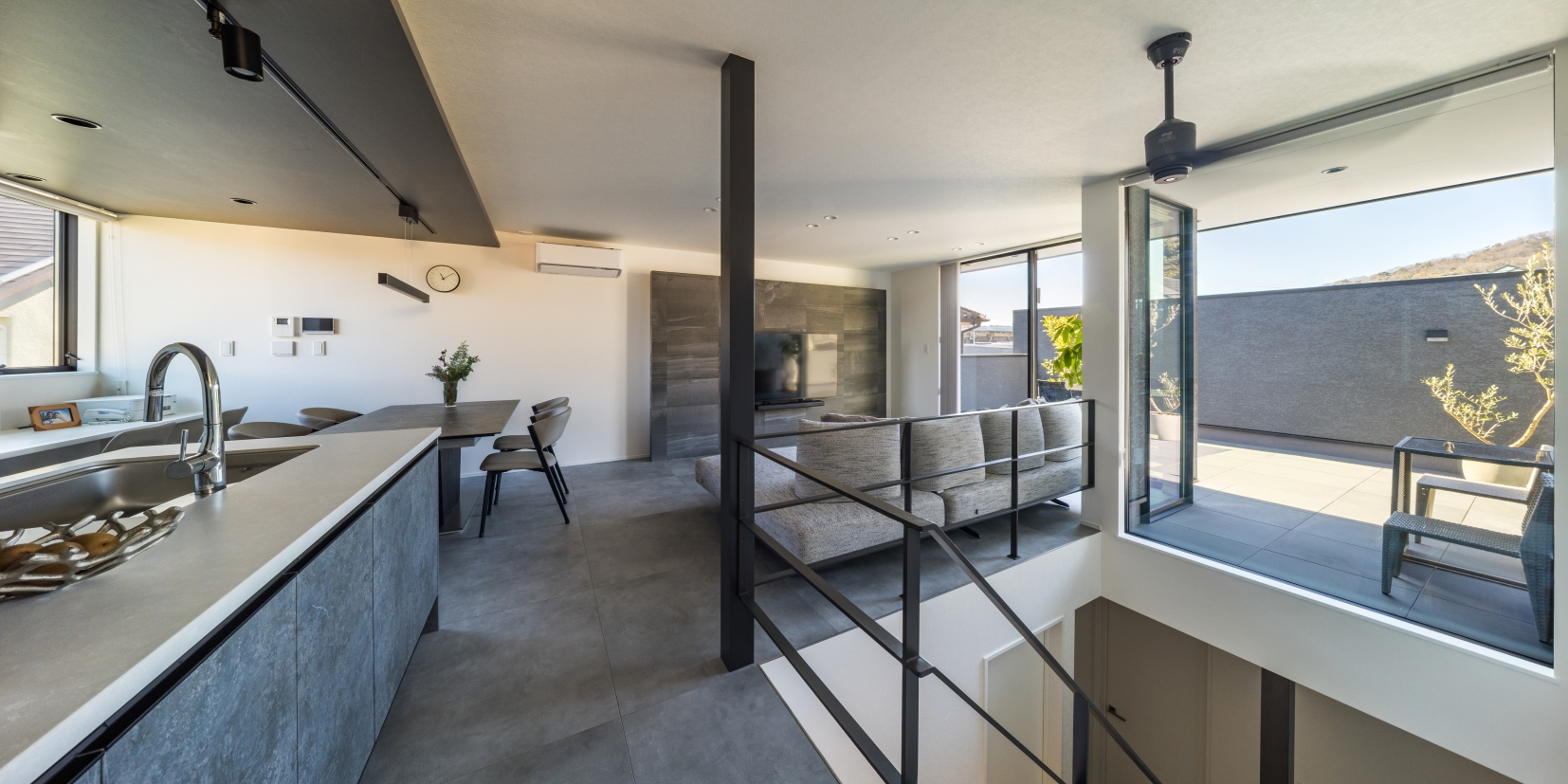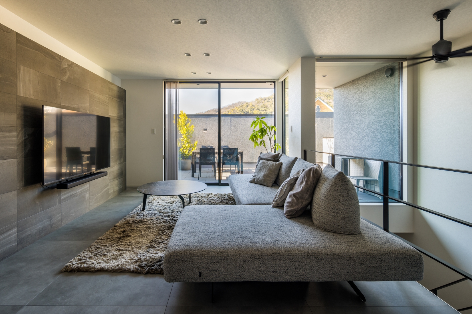 リビングと吹抜けに面した広く壁に囲まれたバルコニーは、外部からの視線を穏やかに遮りながら、空を切り取るような開放感を演出します。