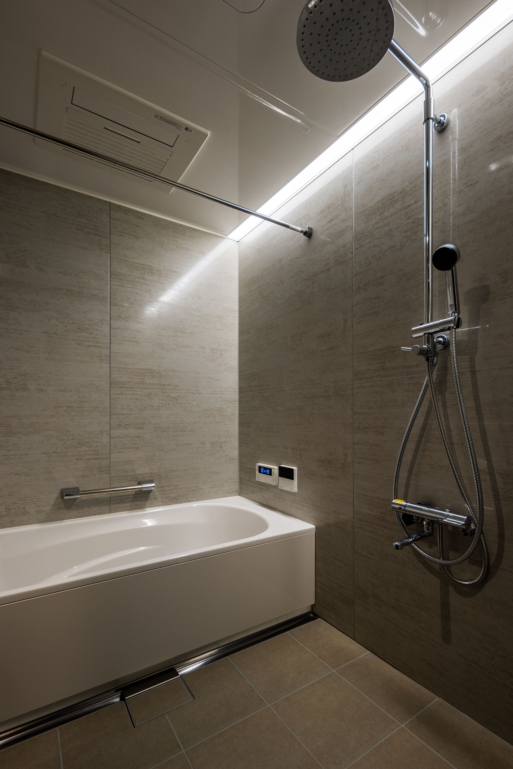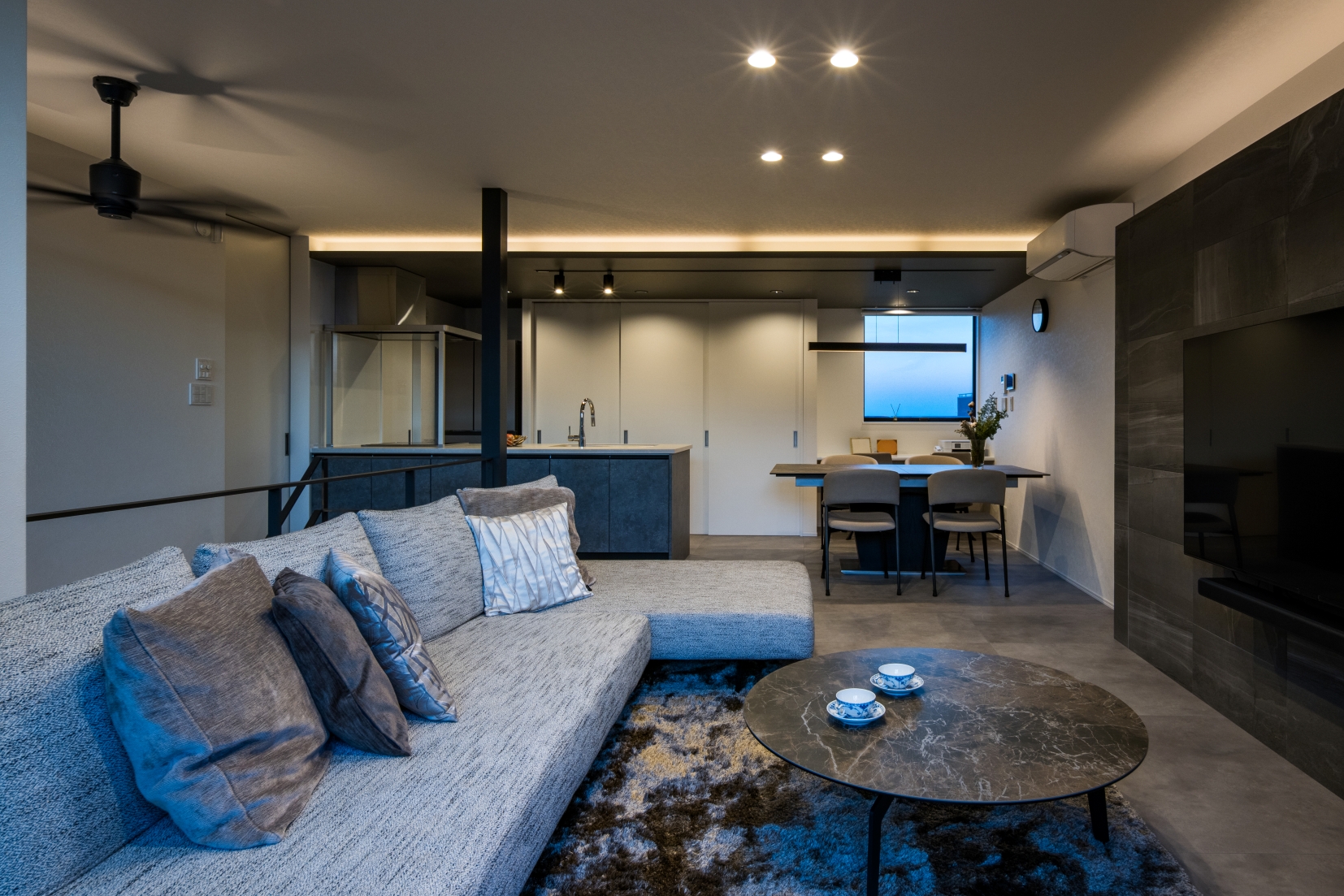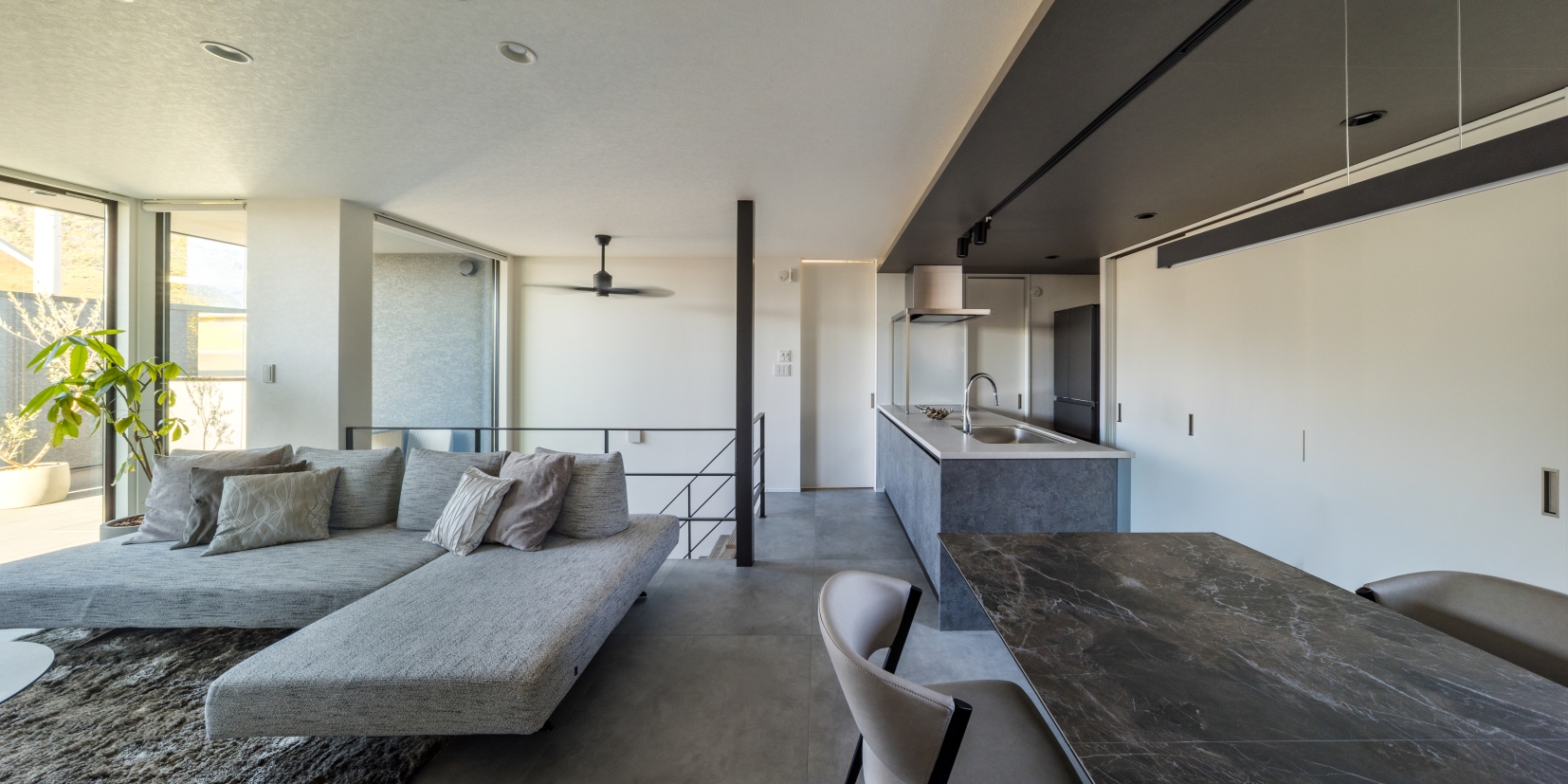LDKはグレートーンで統一し、石目調のアクセントウォールやフロアが落ち着いた上質感を創出。